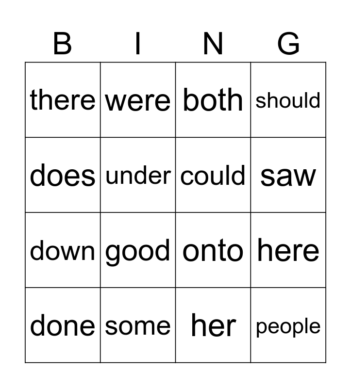 This bingo card has 16 words: some, here, both, there, down, were, onto, her, does, under, done, should, good, saw, could and people.