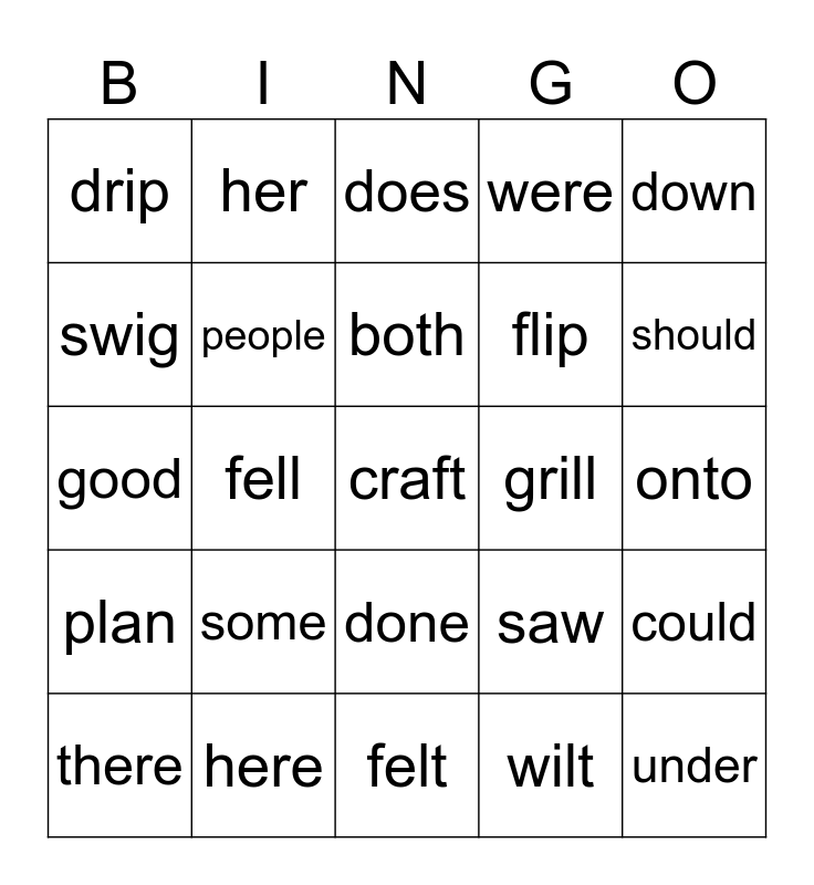 This bingo card has a free space and 24 words: some, here, both, there, down, drip, swig, her, grill, done, flip, good, saw, could, people, wilt, onto, does, should, fell, under, plan, were and felt.