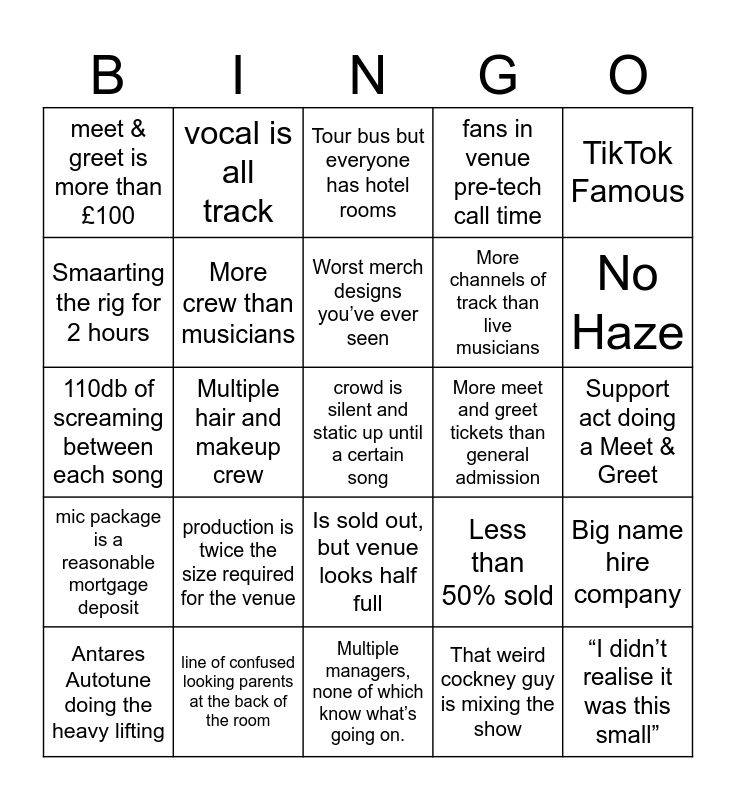 This bingo card has 25 words: production is twice the size required for the venue, Multiple managers, none of which know what’s going on., Worst merch designs you’ve ever seen, Antares Autotune doing the heavy lifting, TikTok Famous, meet & greet is more than £100, Smaarting the rig for 2 hours, vocal is all track, More meet and greet tickets than general admission, Is sold out, but venue looks half full, More channels of track than live musicians, 110db of screaming between each song, Less than 50% sold, Big name hire company, More crew than musicians, “I didn’t realise it was this small”, Support act doing a Meet & Greet, Tour bus but everyone has hotel rooms, No Haze, Multiple hair and makeup crew, crowd is silent and static up until a certain song, line of confused looking parents at the back of the room, mic package is a reasonable mortgage deposit, fans in venue pre-tech call time and That weird cockney guy is mixing the show.