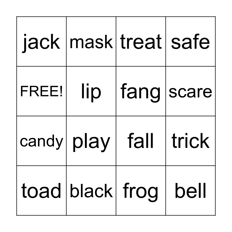 This bingo card has 16 words: black, trick, treat, jack, candy, mask, fall, frog, FREE!, lip, toad, safe, play, scare, fang and bell.