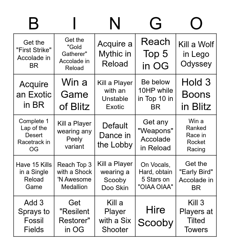 This bingo card has a free space and 28 words: Get the "Early Bird" Accolade in BR, Kill a Player with a Chainsaw, Be below 10HP while in Top 10 in BR, Hire Scooby, Acquire an Exotic in BR, Acquire a Mythic in Reload, Get the "Gold Gatherer" Accolade in Reload, Have 15 Kills in a Single Reload Game, Get any "Weapons" Accolade in Reload, Add 3 Sprays to Fossil Fields, Complete 1 Lap of the Desert Racetrack in OG, Reach Top 5 in OG, Get "Resilent Restorer" in OG, Kill a Player with a Six Shooter, Hold 3 Boons in Blitz, Reach Level 5 in Blitz, Reach Top 3 with a Shock 'N Awesome Medallion, Win a Game of Blitz, Kill a Player with an Unstable Exotic, Kill a Player wearing a Scooby Doo Skin, Get the "First Strike" Accolade in BR, Have 20 Kills in any Solo Gamemode, Kill 3 Players at Tilted Towers, Kill a Player wearing any Peely variant, Win a Ranked Race in Rocket Racing, On Vocals, Hard, obtain 5 Stars on "OIAA OIAA", Kill a Wolf in Lego Odyssey and Defeat the Caretaker in Solo Demon Rush.