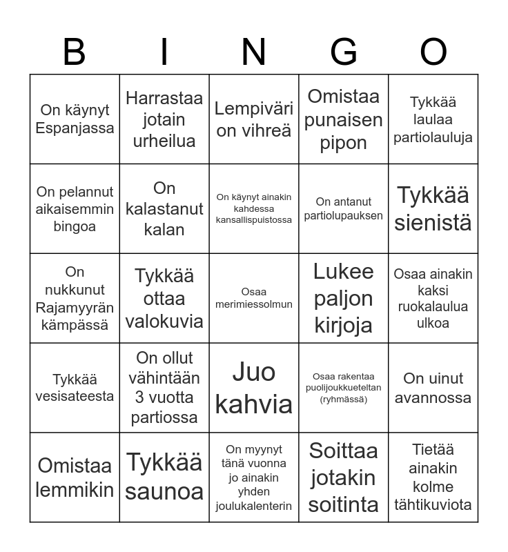 This bingo card has 25 words: On ollut vähintään 3 vuotta partiossa, On myynyt tänä vuonna jo ainakin yhden joulukalenterin, On käynyt ainakin kahdessa kansallispuistossa, Omistaa lemmikin, Tykkää laulaa partiolauluja, On käynyt Espanjassa, On pelannut aikaisemmin bingoa, Harrastaa jotain urheilua, Lukee paljon kirjoja, Juo kahvia, On antanut partiolupauksen, On nukkunut Rajamyyrän kämpässä, Osaa rakentaa puolijoukkueteltan (ryhmässä), On uinut avannossa, On kalastanut kalan, Tietää ainakin kolme tähtikuviota, Osaa ainakin kaksi ruokalaulua ulkoa, Lempiväri on vihreä, Tykkää sienistä, Tykkää ottaa valokuvia, Osaa merimiessolmun, Tykkää saunoa, Tykkää vesisateesta, Omistaa punaisen pipon and Soittaa jotakin soitinta.