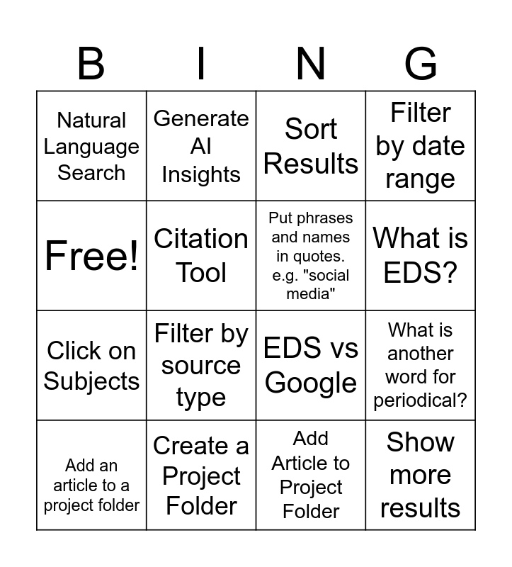 This bingo card has 16 words: Create a Project Folder, What is another word for periodical?, Sort Results, Natural Language Search, Click on Subjects, Generate AI Insights, EDS vs Google, Add Article to Project Folder, Free!, Citation Tool, Add an article to a project folder, Filter by date range, Filter by source type, What is EDS?, Put phrases and names in quotes. e.g. "social media" and Show more results.