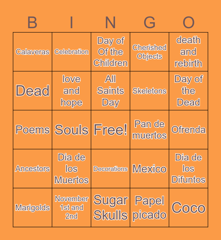 This bingo card has a free space and 24 words: Dia de los Muertos, November 1st and 2nd, All Saints Day, Marigolds, death and rebirth, Calaveras, Dead, Celebration, Pan de muertos, Decorations, Skeletons, Poems, Mexico, Dia de los Difuntos, love and hope, Papel picado, Ofrenda, Day of Of the Children, Day of the Dead, Souls, Coco, Ancestors, Cherished Objects and Sugar Skulls.