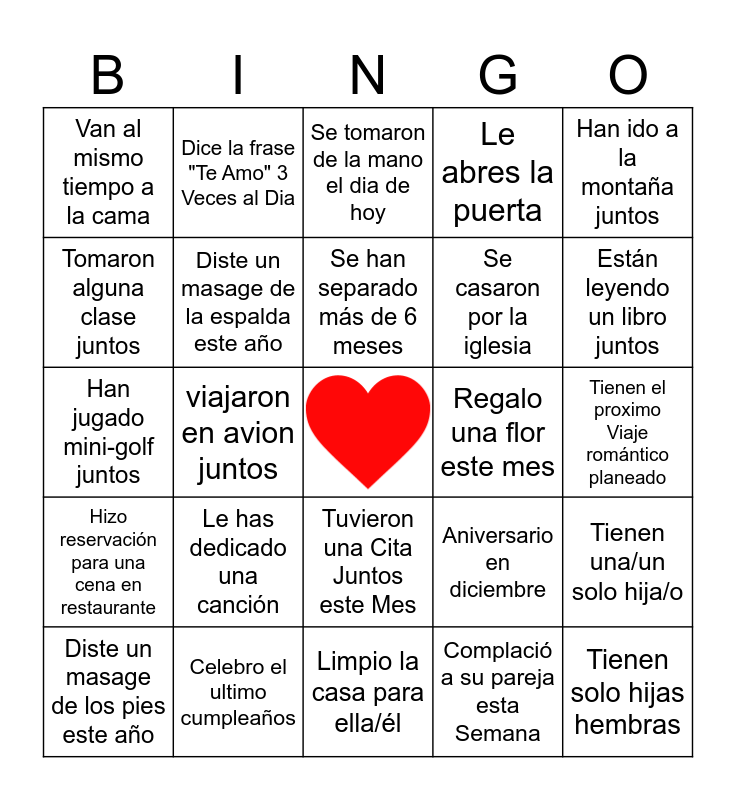 This bingo card has a free space and 94 words: Canta en la ducha, Tienen solo hijos varones, Aniversario de julio, Te abren la Puerta, Casados menos de 5 años, Casados de 5-10 Años, Casados Mas de 10 años, Tuvieron una Cita Juntos este Mes, No hubo luna de miel, Elogio esta semana a su pareja, Expresó Su amor por medio de un texto en los últimos 3 días, Te dijo palabras románticas all oido esta semana, Cocinaron juntos este año, Tienen el proximo Viaje romántico planeado, Tiene Tono de llamada especial para su pareja, Dice la frase "Te Amo" 3 Veces al Dia, Se tomaron de la mano el dia de hoy, Prefiere un regalo que una carta, Prefiere una carta que un regalo, Salieron a caminar juntos como costumbre, Hablaron por largo tiempo de algo fuera de hijos o Problemas este año, Preparó una cena especial para ella/él este año, Complació a su pareja esta Semana, No hubieron discusiones este Mes, Diste un masage de los pies este año, Diste un masage de la espalda este año, Cocino su comida esta semana, Regalo una flor este mes, Regalo una tarjeta este mes, Compro una ropa los ultimos 6 meses, Celebro el ultimo cumpleaños, Limpio la casa para ella/él, Jugaron un juego de mesa (UNO, domino, ajedrez, etc), Ella/él te llama con un sobrenombre, Tomaron alguna clase juntos, Aprendió a conducir después de conocerlo/la, fueron al cine juntos este año, vieron una película juntos este año, Están leyendo un libro juntos, Viajaron por carretera a otro estado el año pasado, viajaron en avion juntos, Se han separado más de 6 meses, Se casaron por la iglesia, Preparado una sopita cuando ella/él se enfermó, Hizo reservación para una cena en restaurante, Dio un regalo sin motivo el año pasado, Regalo flores este año, Aniversario de enero, Aniversario en marzo, Aniversario en mayo, Aniversario en octubre, Aniversario en noviembre, Aniversario en diciembre, Aniversario en septiembre, Aniversario de febrero, Aniversario en abril, Aniversario en junio, Aniversario en agosto, Han sembrado un huerto juntos, Han contado estrellas juntos, Le has dedicado una canción, Le has cantado una canción, Han escrito una lista de sueños/metas juntos, Pidio la novia formalmente a los padres, Presento al novio a los padres formalmente, Han ido a un concierto juntos, Han ido a patinar juntos, Han ido a la playa juntos, Han ido a la montaña juntos, Han ido al mall juntos en los últimos 6 meses, Leído la Biblia juntos, oman te/café/ chocolate juntos al menos una vez por semana, Le dio comida con su mano a su pareja, Tienes la foto de ella/él como fondo de pantalla del teléfono, Han jugado mini-golf juntos, Han jugado boliche/ bolos/ bowling juntos, Han construido/ armado un mueble juntos, Le abres la puerta, Tienen solo hijas hembras, Tienen hijos e hijas, Hijos son mayores de 18 años, Tienen bebe que no camina todavía, Tienen hijo/hija casado/a, Tienen una/un solo hija/o, Van al mismo tiempo a la cama, Salido a montar en bicicleta juntos el último año, Han ido a la iglesia juntos este año, Limpiado la cocina par ella este año, Le has comprado a él una herramienta, Noviazgo a larga distancia, Le enseñaste a manejar a tu pareja, Te has chocado con ella/él en el carro, Tienen foto de los dos enmarcada en la sala and Sabes el nombre de la persona que los presentó.