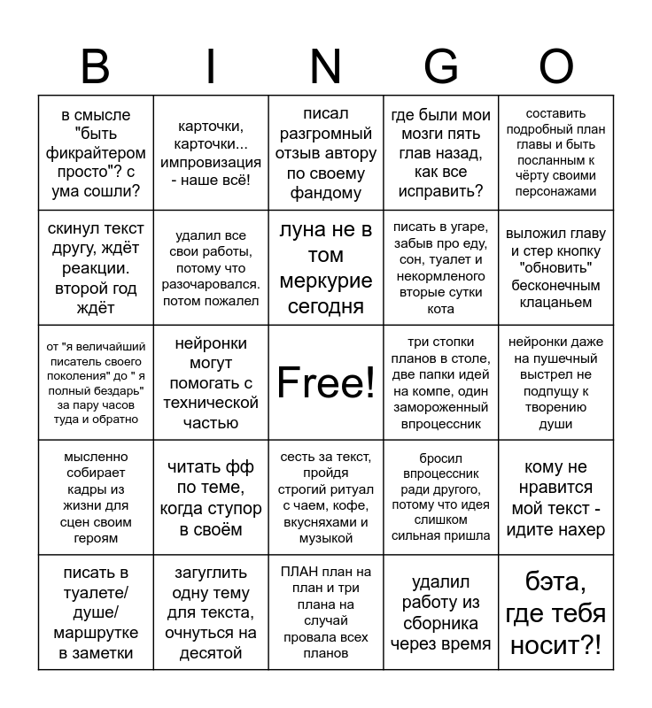 This bingo card has a free space and 24 words: читать фф по теме, когда ступор в своём, загуглить одну тему для текста, очнуться на десятой, луна не в том меркурие сегодня, писать в туалете/душе/маршрутке в заметки, составить подробный план главы и быть посланным к чёрту своими персонажами, в смысле "быть фикрайтером просто"? с ума сошли?, скинул текст другу, ждёт реакции. второй год ждёт, карточки, карточки... импровизация - наше всё!, три стопки планов в столе, две папки идей на компе, один замороженный впроцессник, сесть за текст, пройдя строгий ритуал с чаем, кофе, вкусняхами и музыкой, писать в угаре, забыв про еду, сон, туалет и некормленого вторые сутки кота, от "я величайший писатель своего поколения" до " я полный бездарь" за пару часов туда и обратно, бросил впроцессник ради другого, потому что идея слишком сильная пришла, кому не нравится мой текст - идите нахер, удалил все свои работы, потому что разочаровался. потом пожалел, удалил работу из сборника через время, нейронки даже на пушечный выстрел не подпущу к творению души, писал разгромный отзыв автору по своему фандому, выложил главу и стер кнопку "обновить" бесконечным клацаньем, нейронки могут помогать с технической частью, бэта, где тебя носит?!, мысленно собирает кадры из жизни для сцен своим героям, где были мои мозги пять глав назад, как все исправить? and ПЛАН план на план и три плана на случай провала всех планов.
