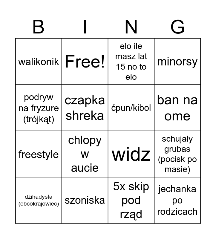 This bingo card has 19 words: widz, ban na ome, elo ile masz lat 15 no to elo, jechanka po rodzicach, schujały grubas (pocisk po masie), podryw na fryzure (trójkąt), 5x skip pod rząd, walikonik, Free!, freestyle, chlopy w aucie, czapka shreka, ćpun/kibol, szoniska, dżihadysta (obcokrajowiec), banderowiec, minorsy, ban na ome and wyk.