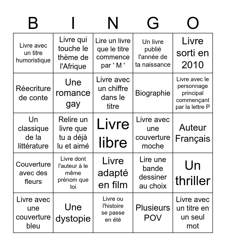 This bingo card has a free space and 24 words: Livre dont l'auteur à le même prénom que toi, Une dystopie, Livre avec un chiffre dans le titre, Livre avec une couverture bleu, Livre sorti en 2010, Livre avec un titre humoristique, Réecriture de conte, Livre qui touche le thème de l'Afrique, Livre avec une couverture moche, Livre adapté en film, Biographie, Un classique de la littérature, Lire une bande dessiner au choix, Un thriller, Une romance gay, Plusieurs POV, Auteur Français, Lire un livre que le titre commence par ' M ', Livre avec le personnage principal commençant par la lettre P, Relire un livre que tu a déjà lu et aimé, Livre avec un titre en un seul mot, Couverture avec des fleurs, Un livre publié l'année de ta naissance and Livre ou l'histoire se passe en été.
