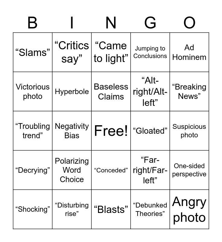 This bingo card has a free space and 37 words: Sensationalization, Cherry-picked data, No source for claim, Hyperbole, One-sided perspective, Polarizing Word Choice, Baseless Claims, Opinion stated as fact, Ad Hominem, Mind reading, Negativity Bias, Jumping to Conclusions, Angry photo, Suspicious photo, Victorious photo, “Decrying”, “Monumental”, “Came to light”, “Conceded”, “Gloated”, “Slams”, “Breaking News”, “Shocking”, “Blasts”, “Baseless claims”, “Debunked Theories”, “Critics say”, “Longstanding Pattern”, “May mean that”, “Seemingly”, “Suggests”, “Disturbing rise”, “Troubling trend”, “Harshly rebuked”, “Far-right/Far-left”, “Alt-right/Alt-left” and “Snowflake”.