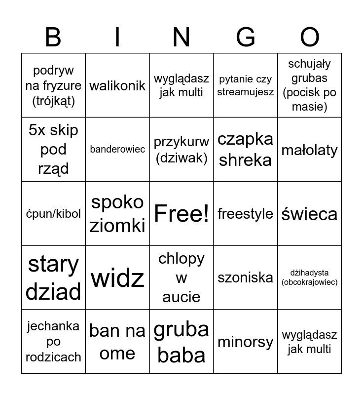 This bingo card has a free space and 24 words: widz, ban na ome, przykurw (dziwak), jechanka po rodzicach, schujały grubas (pocisk po masie), podryw na fryzure (trójkąt), 5x skip pod rząd, walikonik, freestyle, chlopy w aucie, czapka shreka, ćpun/kibol, szoniska, dżihadysta (obcokrajowiec), banderowiec, minorsy, świeca, wyglądasz jak multi, małolaty, spoko ziomki, wyglądasz jak multi, stary dziad, pytanie czy streamujesz and gruba baba.