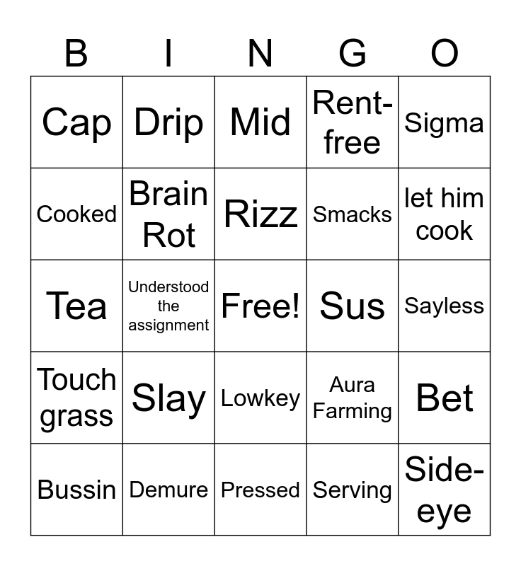 This bingo card has a free space and 24 words: Slay, Demure, Rizz, Bussin, Sigma, Cap, Cooked, Drip, Sus, Lowkey, Smacks, Tea, Aura Farming, Bet, Brain Rot, Serving, Sayless, Mid, let him cook, Understood the assignment, Side-eye, Touch grass, Rent-free and Pressed.