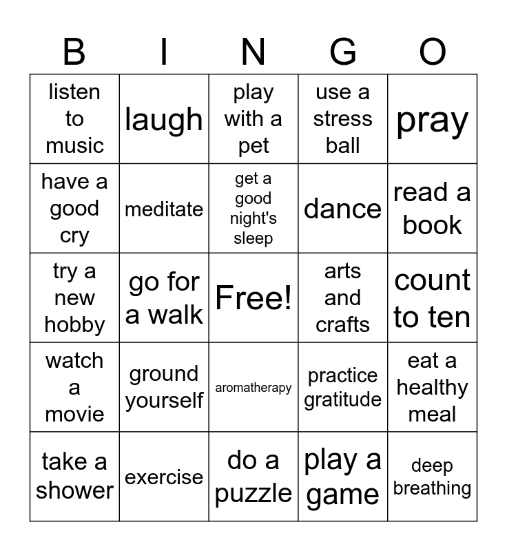 This bingo card has a free space and 29 words: take a shower, drink water, go for a walk, talk with a friend or family, listen to music, play with a pet, meditate, ground yourself, arts and crafts, exercise, count to ten, deep breathing, do a puzzle, play a game, read a book, journal, aromatherapy, watch a movie, pray, try a new hobby, practice gratitude, yoga, dance, have a good cry, use a stress ball, laugh, eat a healthy meal, get a good night's sleep and use a mantra.