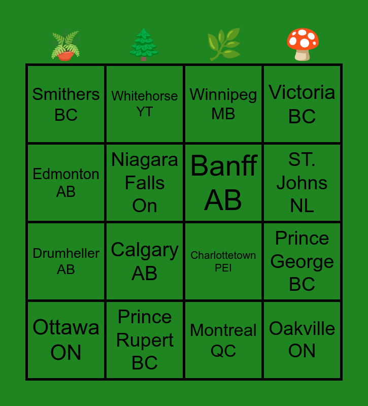 This bingo card has 20 words: Prince George BC, Kelowna BC, Winnipeg MB, Halifax NS, Ottawa ON, Edmonton AB, Prince Rupert BC, Smithers BC, Drumheller AB, Whitehorse YT, Calgary AB, Charlottetown PEI, Niagara Falls On, Oakville ON, Banff AB, Saskatoon SK, ST. Johns NL, Victoria BC, Montreal QC and Regina SK.