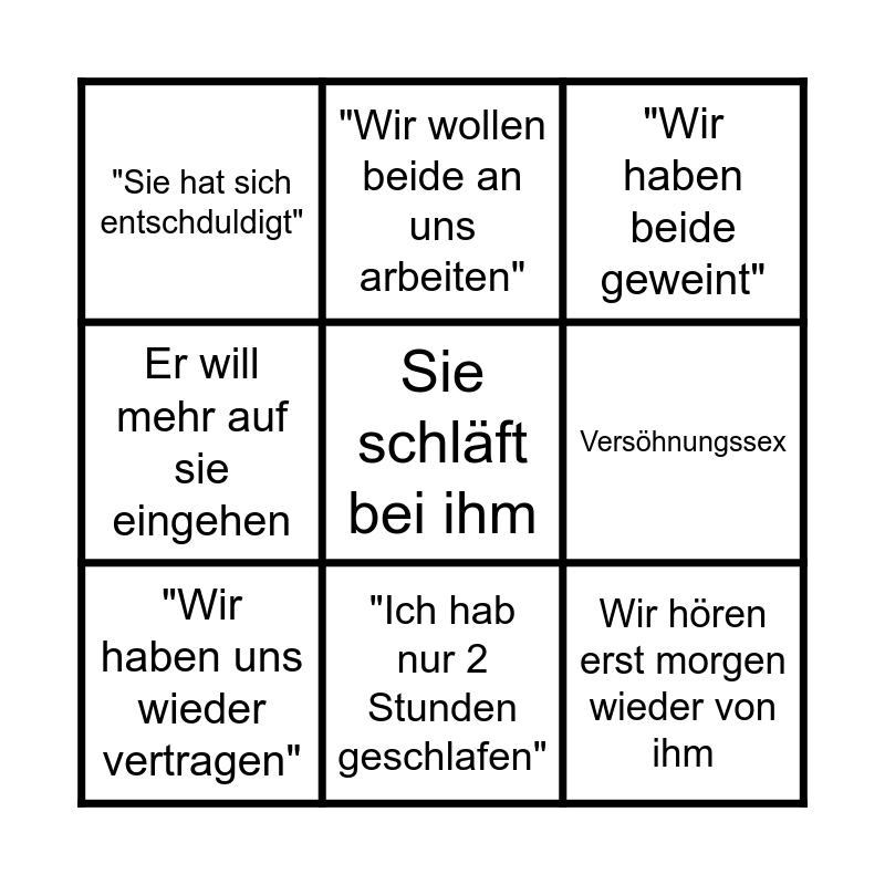 This bingo card has 9 words: "Wir haben uns wieder vertragen", "Wir haben beide geweint", "Wir wollen beide an uns arbeiten", Er will mehr auf sie eingehen, "Sie hat sich entschduldigt", Versöhnungssex, Sie schläft bei ihm, Wir hören erst morgen wieder von ihm and "Ich hab nur 2 Stunden geschlafen".
