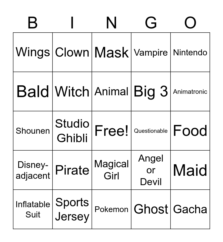 This bingo card has a free space and 24 words: Pirate, Sports Jersey, Animal, Inflatable Suit, Nintendo, Wings, Bald, Clown, Questionable, Magical Girl, Big 3, Shounen, Angel or Devil, Maid, Witch, Ghost, Food, Mask, Animatronic, Studio Ghibli, Gacha, Disney-adjacent, Vampire and Pokemon.