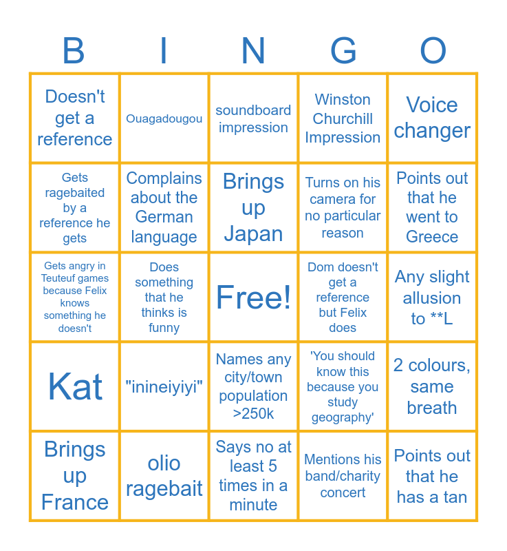 This bingo card has a free space and 24 words: "inineiyiyi", olio ragebait, Brings up Japan, Brings up France, Voice changer, Doesn't get a reference, Gets ragebaited by a reference he gets, Ouagadougou, Dom doesn't get a reference but Felix does, Names any city/town population >250k, Turns on his camera for no particular reason, Gets angry in Teuteuf games because Felix knows something he doesn't, 'You should know this because you study geography', 2 colours, same breath, Complains about the German language, Mentions his band/charity concert, Any slight allusion to **L, soundboard impression, Points out that he went to Greece, Does something that he thinks is funny, Points out that he has a tan, Kat, Winston Churchill Impression and Says no at least 5 times in a minute.