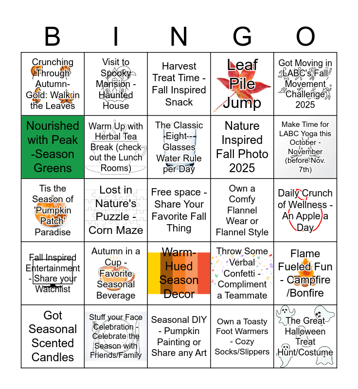 This bingo card has 18 images, a free space and 24 words: Autumn in a Cup - Favorite Seasonal Beverage, Stuff your Face Celebration - Celebrate the Season with Friends/Family, The Classic Eight -Glasses Water Rule per Day, Got Seasonal Scented Candles, Got Moving in LABC's Fall Movement Challenge 2025, Crunching Through Autumn-Gold: Walk in the Leaves, Nourished with Peak -Season Greens, Visit to Spooky Mansion -Haunted House, Own a Comfy Flannel Wear or Flannel Style, Warm-Hued Season Decor, Nature Inspired Fall Photo 2025, Tis the Season of 'Pumpkin Patch' Paradise, Throw Some Verbal Confetti - Compliment a Teammate, Flame Fueled Fun - Campfire /Bonfire, Warm Up with Herbal Tea Break (check out the Lunch Rooms), Own a Toasty Foot Warmers - Cozy Socks/Slippers, Daily Crunch of Wellness - An Apple a Day, Harvest Treat Time - Fall Inspired Snack, Make Time for LABC Yoga this October - November (before Nov. 7th), Lost in Nature's Puzzle - Corn Maze, The Great Halloween Treat Hunt/Costume, Fall Inspired Entertainment - Share your Watchlist, Leaf Pile Jump and Seasonal DIY - Pumpkin Painting or Share any Art.