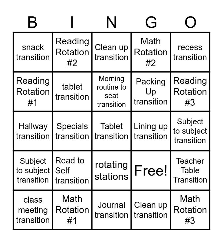 This bingo card has 25 words: Read to Self transition, Journal transition, Morning routine to seat transition, class meeting transition, recess transition, snack transition, Reading Rotation #1, Reading Rotation #2, Lining up transition, rotating stations, Packing Up transition, Hallway transition, Free!, Teacher Table Transition, tablet transition, Math Rotation #3, Subject to subject transition, Clean up transition, Reading Rotation #3, Specials transition, Tablet transition, Math Rotation #1, Subject to subject transition, Math Rotation #2 and Clean up transition.
