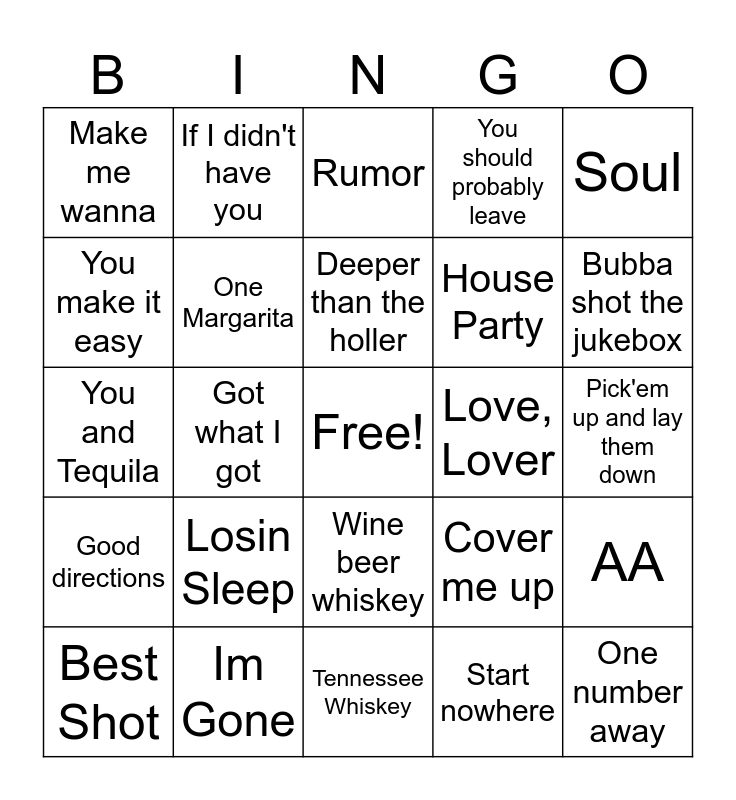 This bingo card has a free space and 85 words: Hard to forget, Can I, Rumor, Beer never broke my heart, Lovin on you, 1, 2 many, Be like that, Dance with me, Die a happy man, On me, Drunk on Your love, I hope you're happy now, One Margarita, Love, Lover, The long way, Make me wanna, Best Shot, You make it easy, Take it from me, Hard to love, Knockin Boots, House Party, One number away, The git upLove someone, Got what I got, I'm comin over, Unforgettable, When it rains it pours, Wagon Wheel, Bottoms up, Losin Sleep, Burning house, Hangin on, You and Tequila, Why don't we just dance, One thing right, Tennessee Whiskey, Your man, Good directions, Bubba shot the jukebox, No one needs to know, Come back song, Leave the night on, Rain is a good thing, All my friends say, Tequila makes her clothes fall off, Make me wanna, Aw naw, Just got started lovin you, Gettin you home, If I didn't have you, Deeper than the holler, It's a little too late, Wrapped around, She likes it, Holy Water, Im Gone, You should probably leave, Details, Famous friends, The kind of love we make, Beer never broke my heart, Like I love country music, Leave you alone, What he didn't do, Soul, Til you can't, AA, Beer with my friends, That's how country boys rollu I could drink, hole in the bottle, You're drunk, go home, What I have, You proof, Off the deep end, Wine beer whiskey, Start nowhere, I can lie, Weed with Willie, YOu ain't much fun, Pick'em up and lay them down, Red solo cup, Stay a little longer, Cover me up and Told yo.