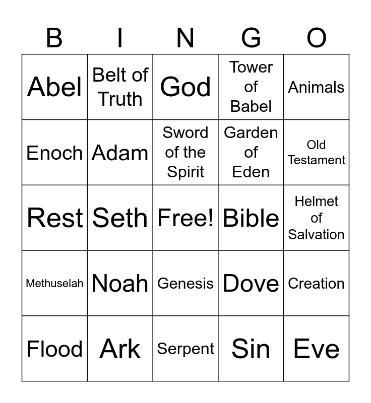 This bingo card has a free space and 28 words: Creation, Armor of God, Garden of Eden, Sin, Enoch, God, Belt of Truth, Methuselah, Bible, Flood, Rest, Tower of Babel, Ark, Serpent, Old Testament, Cain, Noah, Adam, Sword of the Spirit, Genesis, Abel, Rainbow, Eve, Seth, Helmet of Salvation, Dove, Animals and Language.