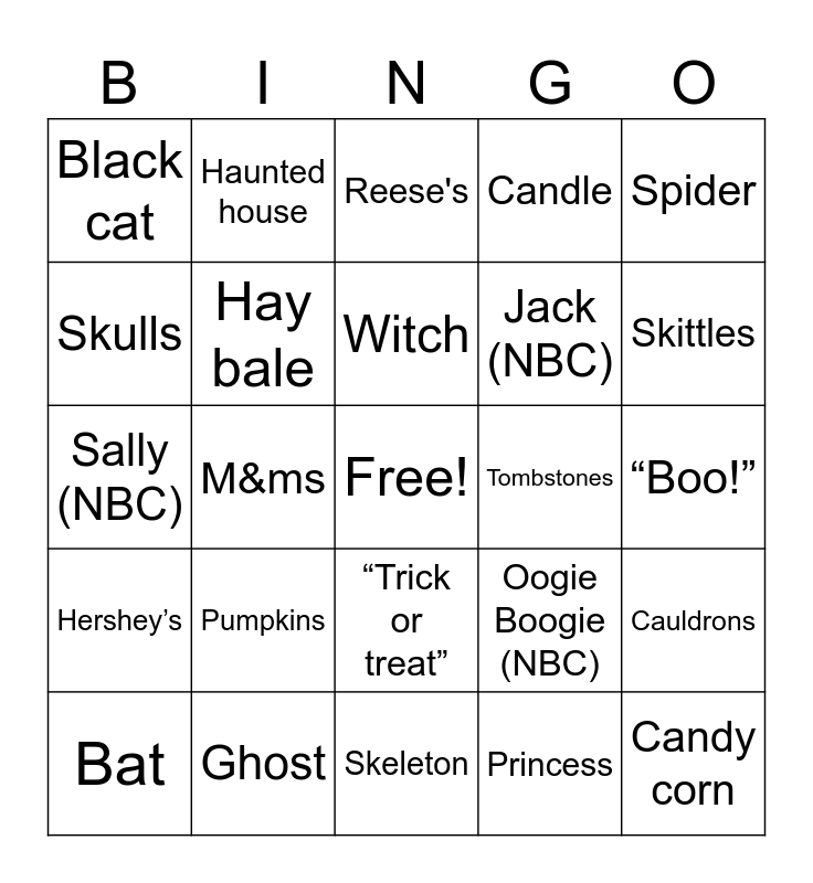 This bingo card has a free space and 24 words: Pumpkins, Ghost, Witch, Bat, Spider, Black cat, Skulls, Haunted house, Tombstones, “Trick or treat”, Jack (NBC), Sally (NBC), Oogie Boogie (NBC), Cauldrons, Hay bale, Princess, “Boo!”, Reese's, Skittles, M&ms, Candy corn, Hershey’s, Candle and Skeleton.