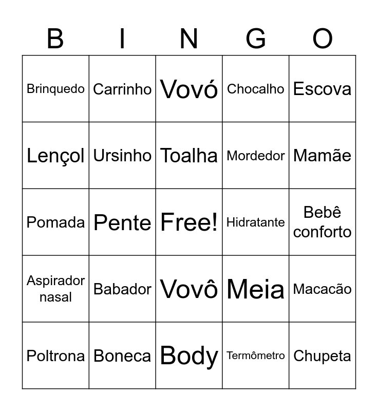 This bingo card has a free space and 50 words: Mamadeira, Chupeta, Fralda, Body, Babador, Berço, Carrinho, Naninha, Lençol, Manta, Ursinho, Chocalho, Macacão, Meia, Luva, Banheira, Toalha, Hidratante, Sabonete, Escova, Pente, Termômetro, Brinquedo, Mordedor, Fralda de boca, Almofada Amamentação, Mamãe, Papai, Vovó, Vovô, Cueiro, Fralda de ombro, Mala Maternidade, Coberta, Boneca, Banho, Soneca, Berço portátil, Babá Eletrônica, Bebê conforto, Kit higiene, Lenço umedecido, Mijão, Algodão, Poltrona, Pomada, Trocador, Touca, Aspirador nasal and Leite.