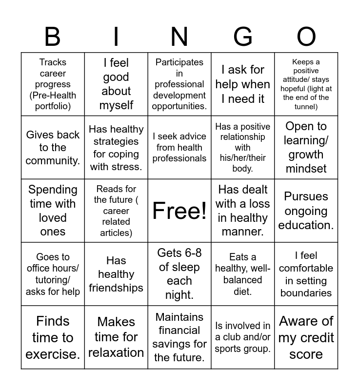 This bingo card has a free space and 29 words: Finds time to exercise., Spends time outdoors/nature, Reads for the future ( career related articles), Volunteers., Tracks career progress (Pre-Health portfolio), Participates in professional development opportunities., Has healthy strategies for coping with stress., Has healthy friendships, Has dealt with a loss in healthy manner., Makes time for relaxation, Pursues ongoing education., Aware of my credit score, Maintains financial savings for the future., Is involved in a club and/or sports group., Open to learning/ growth mindset, Schedules and takes breaks throughout the day., Gets 6-8 of sleep each night., Goes to office hours/ tutoring/ asks for help, Keeps a positive attitude/ stays hopeful (light at the end of the tunnel), Spending time with loved ones, Eats a healthy, well-balanced diet., Understands how to build credit and use credit cards wisely, Has a positive relationship with his/her/their body., Gives back to the community., I ask for help when I need it, I feel good about myself, I feel comfortable in setting boundaries, I seek advice from health professionals and I maintain a balance with friends, family, work, school.