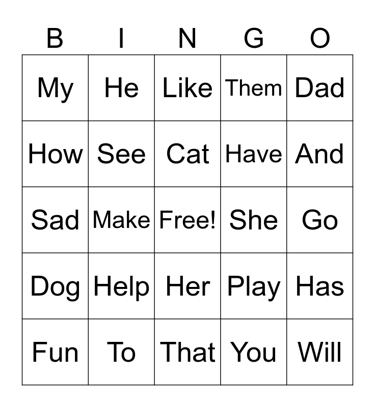 This bingo card has a free space and 34 words: Boy, You, It, The, Dog, See, Dad, Fun, He, Him, Cat, Like, With, Girl, She, And, To, Sad, Help, Play, Her, Good, My, Go, That, Will, Them, Look, Have, How, Into, Make, Has and Some.