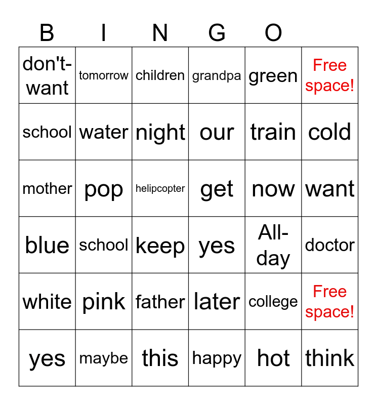 This bingo card has 36 words: later, father, happy, school, blue, get, water, this, green, college, cold, grandpa, Free space!, pop, our, don't- want, white, now, mother, children, helipcopter, school, yes, keep, All-day, tomorrow, train, maybe, night, Free space!, think, yes, doctor, want, pink and hot.