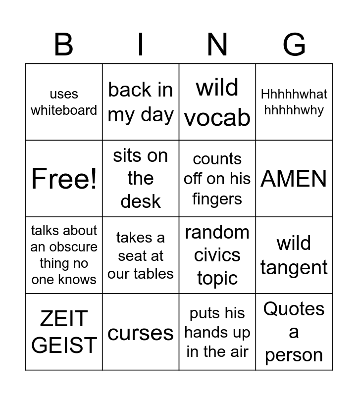 This bingo card has 16 words: curses, wild tangent, wild vocab, uses whiteboard, talks about an obscure thing no one knows, back in my day, random civics topic, puts his hands up in the air, Free!, sits on the desk, ZEIT GEIST, Hhhhhwhat hhhhhwhy, takes a seat at our tables, AMEN, counts off on his fingers and Quotes a person.