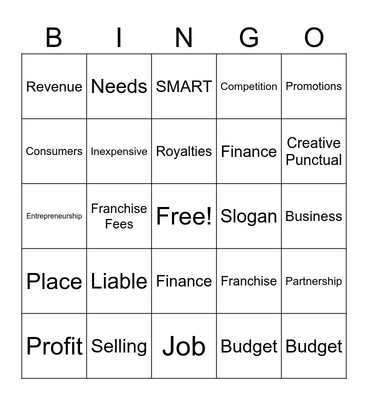 This bingo card has a free space and 54 words: Factors of Production, Place, Price, Products, Finance, Entrepreneur, Competition, sole-proprietor, Consumers, Tangible, Revenue, Expenses, Selling, Profit, Wants, Job, Budget, Finance, Career, Business, Franchise, Manager, Slogan, Promotions, Services, Needs, Goods, Investors, Customer Service, Budget, Capital, Stakeholder, Employment, Career, SMART, Employment, Entrepreneurship, Partnership, Unlimited Liability, Inexpensive, Owner, Financial, Dissolve, Share Ideas, Liable, Franchisor, Royalty Fee, Liquid Capital, Royalties, Franchise Fees, Creative Punctual, Ethics, Target Market and Demographics.