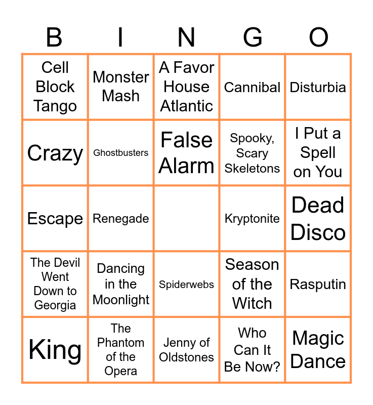 This bingo card has a free space and 79 words: (Don't Fear) The Reaper, 50 Ways to Say Goodbye, A Favor House Atlantic, Abracadabra, Addams Family Theme, All The Things She Said, Back to Black, bad guy, Bells in Santa Fe, Blinding Lights, Bring Me To Life, Can't Feel My Face, Cannibal, Cell Block Tango, Cold Hearted, Crazy, Creep, Dancing in the Moonlight, Dark Lady, Dead Disco, Dead Man's Party, Disturbia, Escape, False Alarm, Ghostbusters, Goosebumps Original Theme Song, Headstrong, Heartless, Heathens, Hungry Like the Wolf, I Put a Spell on You, I'm In Love With a Monster, Jenny of Oldstones, Judas, King, Kryptonite, Little Talks, Love Me Dead, Lying Is the Most Fun a Girl Can Have Without Taking Her Clothes Off, Magic Dance, Maneater, Maniac, Men in Black, Mitternacht, Monster, Monster Mash, My Songs Know What You Did in the Dark, Pink Pony Club, Poor Unfortunate Souls, Psycho Killer, Rasputin, Renegade, Season of the Witch, Seven Nation Army, She Wolf, Sleepwalk, Slipping, Smooth Criminal, Somebody's Watching Me, Spiderwebs, Spooky, Scary Skeletons, Starboy, Super Freak, Superstition, Sweater Weather, Take Me to Church, Talking In Your Sleep, Tear You Apart, That Funny Feeling, The Devil Went Down to Georgia, The Phantom of the Opera, This is Halloween, Thriller, W.I.T.C.H, Werewolves of London, Who Can It Be Now?, You Spin Me Round, You're Dead and Zombie.