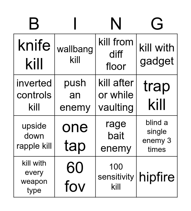 This bingo card has 18 words: one tap, hipfire, kill from diff floor, knife kill, rage bait enemy, kill with gadget, kill with every weapon type, wallbang kill, trap kill, upside down rapple kill, 100 sensitivity kill, inverted controls kill, blind a single enemy 3 times, push an enemy, kill after or while vaulting, visit every site and get a kill, 60 fov and 0 brightness.