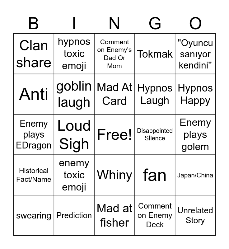 This bingo card has a free space and 24 words: swearing, enemy toxic emoji, Mad At Card, Comment on Enemy Deck, ''Oyuncu sanıyor kendini'', Clan share, hypnos toxic emoji, Comment on Enemy's Dad Or Mom, Disappointed Sİlence, Enemy plays golem, Enemy plays EDragon, goblin laugh, fan, Japan/China, Anti, Prediction, Mad at fisher, Tokmak, Hypnos Happy, Historical Fact/Name, Loud Sigh, Whiny, Hypnos Laugh and Unrelated Story.
