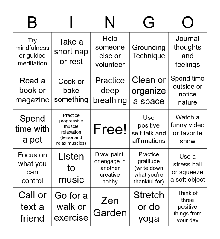 This bingo card has a free space and 24 words: Listen to music, Go for a walk or exercise, Practice deep breathing, Call or text a friend, Journal thoughts and feelings, Try mindfulness or guided meditation, Read a book or magazine, Take a short nap or rest, Use positive self-talk and affirmations, Draw, paint, or engage in another creative hobby, Clean or organize a space, Spend time with a pet, Practice gratitude (write down what you’re thankful for), Use a stress ball or squeeze a soft object, Cook or bake something, Stretch or do yoga, Watch a funny video or favorite show, Help someone else or volunteer, Spend time outside or notice nature, Practice progressive muscle relaxation (tense and relax muscles), Think of three positive things from your day, Focus on what you can control, Grounding Technique and Zen Garden.