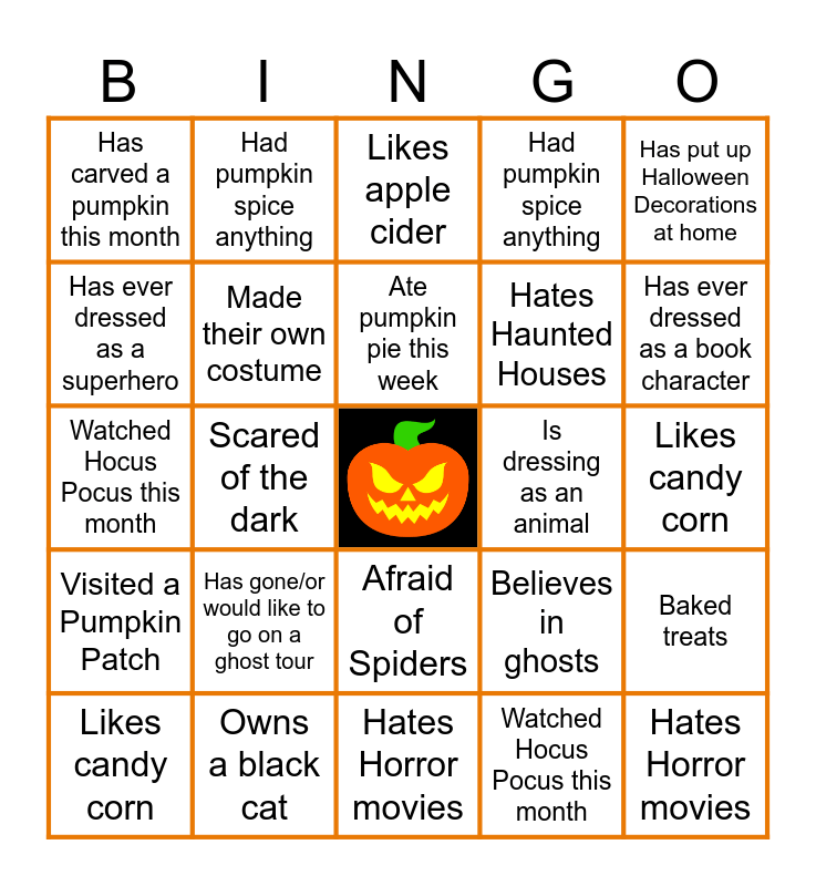 This bingo card has a free space and 40 words: Baked treats, Watched Hocus Pocus this month, Loves Horror movies, Made their own costume, Owns a black cat, Afraid of Spiders, Ate pumpkin pie this week, Hates Haunted Houses, Has put up Halloween Decorations at home, Visited a Pumpkin Patch, Scared of the dark, Had pumpkin spice anything, Hates Horror movies, Likes candy corn, Is dressing as an animal, Has gone/or would like to go on a ghost tour, Scared of Clowns, Has carved a pumpkin this month, Will trick or treat this year, Likes apple cider, Baked treats, Watched Hocus Pocus this month, Hates Haunted Houses, Has ever dressed as a superhero, Has put up Halloween Decorations at home, Afraid of Spiders, Likes pumpkin pie, Loves Horror movies, Will trick or treat this year, Has a black cat, Visited a Pumpkin Patch, Likes candy corn, Made their own costume, Believes in ghosts, Has ever dressed as a book character, Hates Horror movies, Has carved a pumpkin this month, Scared of the dark, Had pumpkin spice anything and Same favorite candy as you.