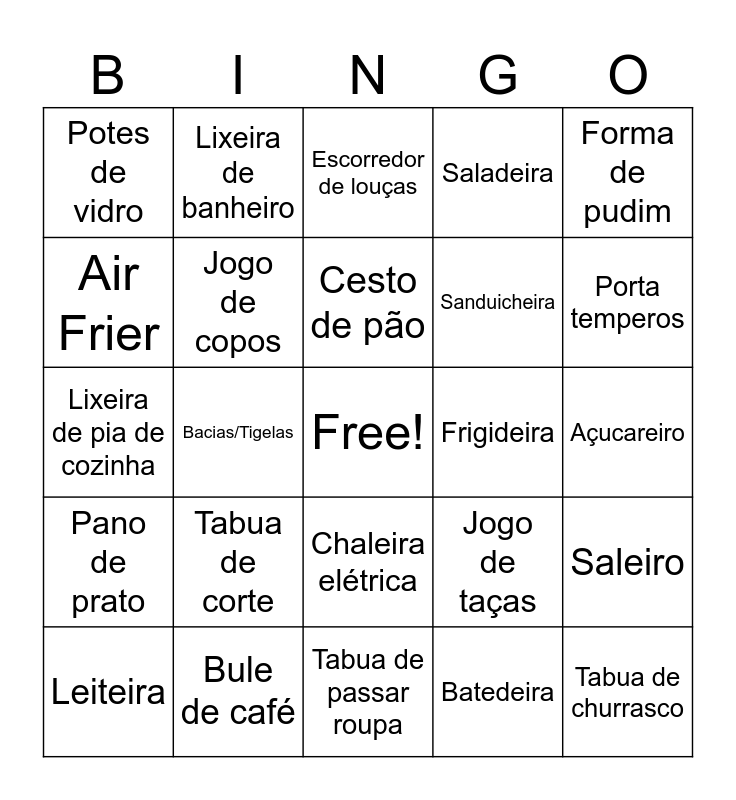 This bingo card has a free space and 36 words: Jogo de panelas, Jogo de talher, Jogo de prato fundo, Jogo de copos, Jogo de taças, Pano de prato, Cesto de pão, Formas para bolo, Forma de pudim, Assadeira com tampa, Bacias/Tigelas, Saladeira, Chaleira, Frigideira, Porta temperos, Potes de vidro, Travessas/refratarios, Tabua de corte, Tabua de churrasco, Escorredor de louças, Açucareiro, Saleiro, Bule de café, Leiteira, Tabua de passar roupa, Lixeira de banheiro, Lixeira de pia de cozinha, Garrafa térmica, Sanduicheira, Air Frier, Mixer, Liquidificador, Batedeira, Chaleira elétrica, Ferro de passar and Cafeteira.