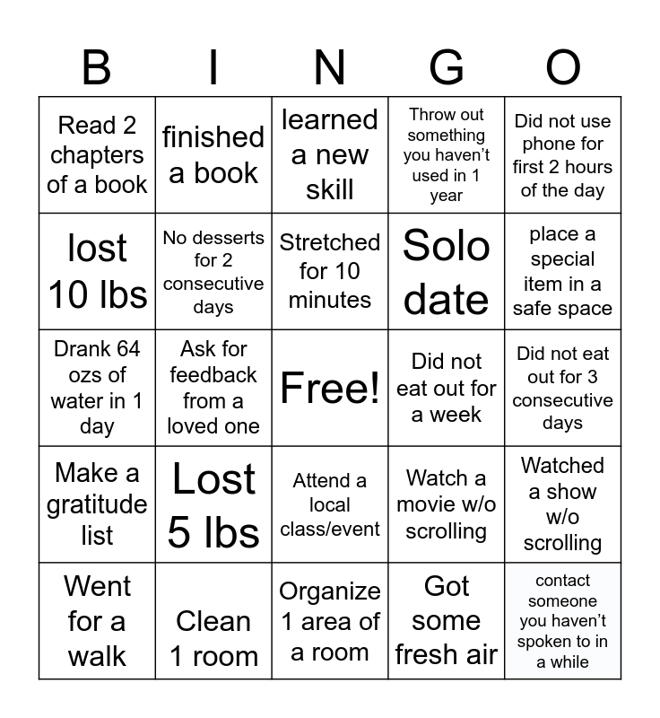 This bingo card has a free space and 24 words: Went for a walk, Lost 5 lbs, Stretched for 10 minutes, Got some fresh air, Did not use phone for first 2 hours of the day, Read 2 chapters of a book, finished a book, learned a new skill, Did not eat out for a week, Did not eat out for 3 consecutive days, Drank 64 ozs of water in 1 day, No desserts for 2 consecutive days, Watch a movie w/o scrolling, Watched a show w/o scrolling, lost 10 lbs, Clean 1 room, Organize 1 area of a room, Throw out something you haven’t used in 1 year, place a special item in a safe space, Make a gratitude list, Ask for feedback from a loved one, Attend a local class/event, Solo date and contact someone you haven’t spoken to in a while.