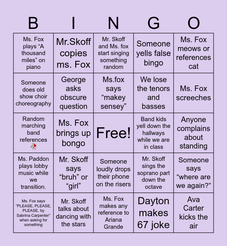 This bingo card has a free space and 24 words: Mr. Skoff says “bruh” or “girl”, Mr. Skoff talks about dancing with the stars, Ms.fox says “makey sensey”, Ms. Fox says “PLEASE, PLEASE, PLEASE, by Sabrina Carpenter” when asking for something, Ms. Fox meows or references cat, Ms. Fox plays “A thousand miles” on piano, Someone does old show choir choreography, Mr.Skoff copies ms. Fox, Band kids yell down the hallways while we are in class, Someone loudly drops their phone on the risers, We lose the tenors and basses, Random marching band references 🥀, Mr. Skoff sings the soprano part down the octave, Someone says “where are we again?”, George asks obscure question, Dayton makes 67 joke, Anyone complains about standing, Mr. Skoff and Ms. fox start singing something random, Ms. Fox screeches, Ms. Fox brings up bongo, Ava Carter kicks the air, Ms. Paddon plays lobby music while we transition., Someone yells false bingo and Ms. Fox makes any reference to Ariana Grande.