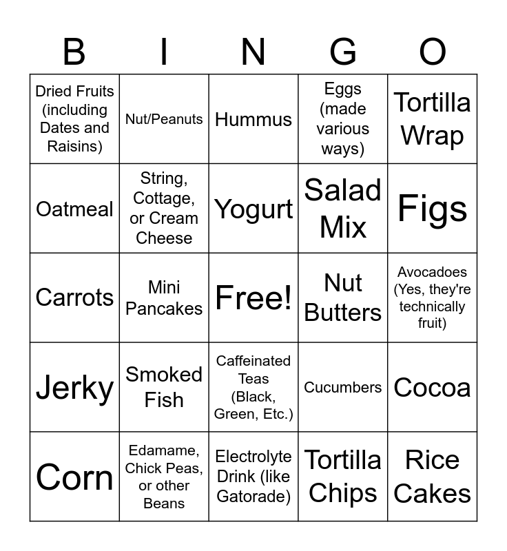 This bingo card has a free space and 89 words: Beef (made various ways), Cereal, Caffeinated Teas (Black, Green, Etc.), Apples, Asparagus, Canned Fish, Crackers, Cider, Apricots, Beets, Chicken (made various ways), Granola, Cocoa, Avocadoes (Yes, they're technically fruit), Bell Peppers, Yogurt, Healthy Breads, Coffee, Bananas, Broccoli, Cubed or Sliced Cheese, Healthy Pastas, Electrolyte Drink (like Gatorade), Berries and/or Cherries, Carrots, Edamame, Chick Peas, or other Beans, Mini Bagels, Healthy Smoothie, Citrus (such as Oranges), Cauliflower, Eggs (made various ways), Mini Pancakes, Herbal Teas, Dried Fruits (including Dates and Raisins), Celery, Hummus, Oatmeal, Lemonade, Figs, Corn, Jerky, Pita Bread, Milk, Fruit Sauces/Pouches/Puree (like Apple Sauce), Cucumbers, Nut Butters, Popcorn, Grapes, Dried Veggie Snacks/Chips, Nut/Peanuts, Potatoes, Protein Shake, Kiwi, Green Beans, Pork (made various ways), Pretzels, Real Juice, Mangoes, Kale, Salami, Quinoa, Soda (in moderation), Melon, Mushrooms, Sausage, Rice, Sparkling Water, Peaches, Radishes, Smoked Fish, Rice Cakes, Vegetable Juice, Pears, Salad Mix, String, Cottage, or Cream Cheese, Tortilla Chips, Water, Pineapple, Spinach, Tofu (made various ways), Tortilla Wrap, Water with flavoring or infused with fruit juice, Plums, Squash, Turkey (made various ways), Waffles, Milk Alternative (Soy, Almond, Oat, Etc.), Tomatoes (Yes, they're technically fruit) and Sugar Snap Peas.