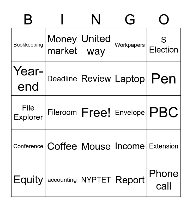 This bingo card has a free space and 102 words: RBT, Remarkable, United way, Goose, Tax, Audit, Financial, 1040, Post it, 1120, eFile, eSignature, forms, financial statement, ticket, email, accounting, mail log, sharefile, excel, practice, ultra tax, dataSnipper, team member, CaseWare, File Explorer, Fileroom, Fixed assets, Gruntworx, Quickbooks, Bookkeeping, Deadline, Sharefile, Zoom, Phone call, Conference, Voicemail, Email, Workpapers, PBC, Tax Return, Tax Notice, Correspondence, Report, Extension, Payroll, 1099, NYPTET, FBAR, Sales Tax, IT-204-LL, ITAP, Review, Gift Tax, 1120S, Efile Checklist, 1041, 709, Schedule C, S Election, Efile Inbox, 1040Portal, IT, Administration, Accountant, Auditor, CPA, Mouse, Laptop, Pen, Green Sheets, Spreadsheet, Community, Office Elf, Firm, Citrix, Coffee, Bound, Process map, Adding machine, Staple, Paper clip, Folder, Envelope, Payment, Year-end, Cash flows, Functional expenses, Notes, Statement of activites, Assets, Liabilities, Net assets, Revenue, Contract, Equity, Money market, Credit, Income, Stock, Bond and 1098.