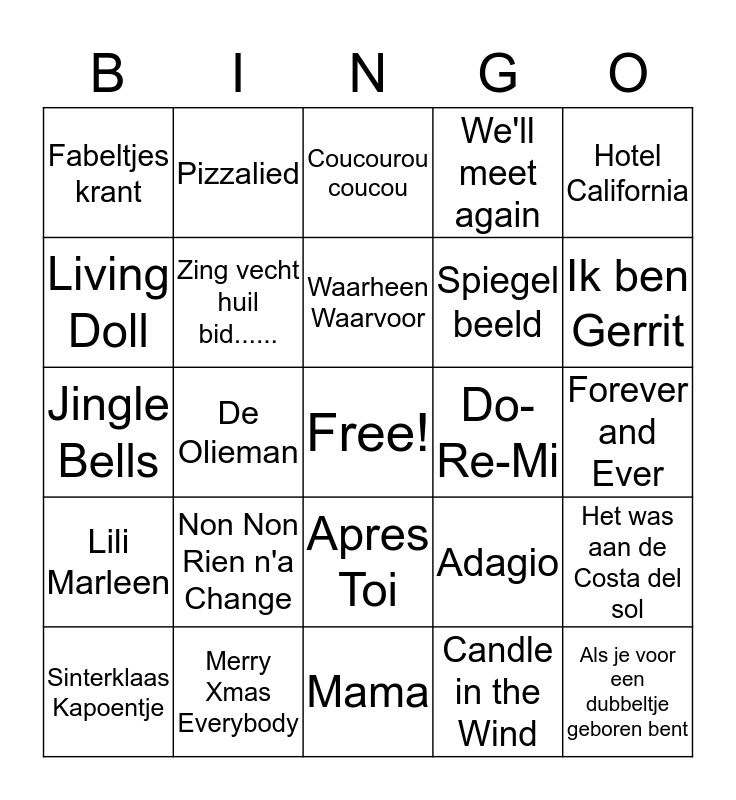 This bingo card has a free space and 24 words: Non Non Rien n'a Change, Merry Xmas Everybody, Waarheen Waarvoor, Sinterklaas Kapoentje, Hotel California, Fabeltjes krant, Living Doll, Pizzalied, Do-Re-Mi, Apres Toi, Spiegel beeld, Jingle Bells, Adagio, Het was aan de Costa del sol, Zing vecht huil bid......, Candle in the Wind, Forever and Ever, Coucourou coucou, Ik ben Gerrit, De Olieman, Als je voor een dubbeltje geboren bent, Lili Marleen, We'll meet again and Mama.