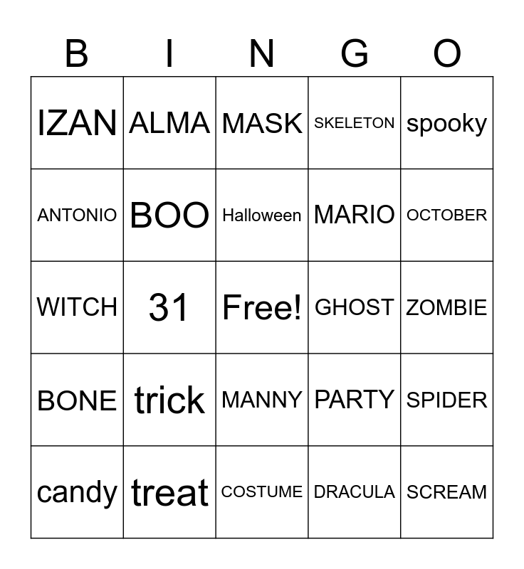 This bingo card has a free space and 24 words: trick, treat, Halloween, candy, spooky, IZAN, ANTONIO, ALMA, GHOST, MANNY, MARIO, WITCH, PARTY, SPIDER, BOO, DRACULA, ZOMBIE, MASK, OCTOBER, 31, SCREAM, BONE, SKELETON and COSTUME.