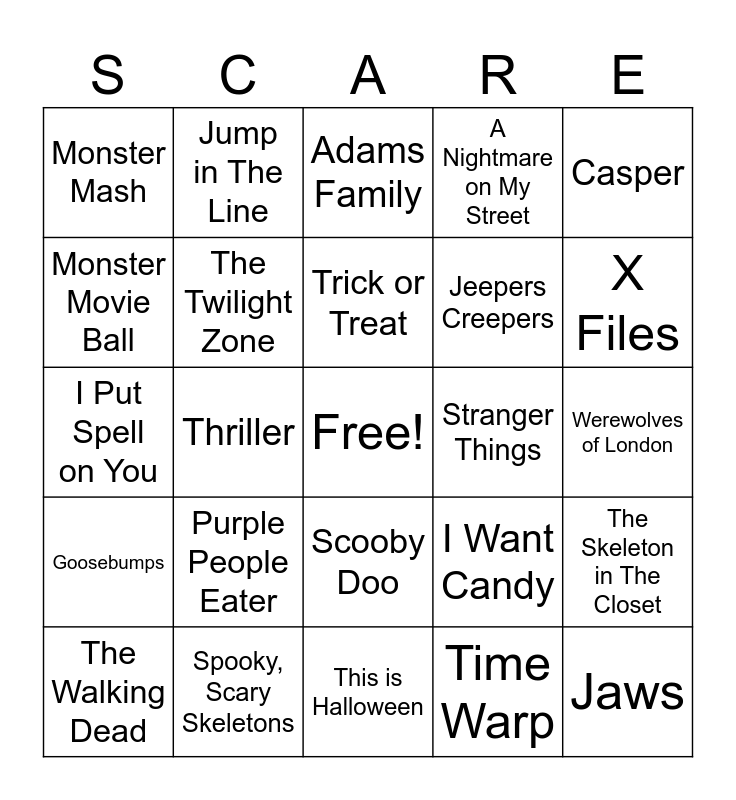 This bingo card has a free space and 31 words: This is Halloween, Ghostbusters, Thriller, Halloween Theme Song, Monster Mash, Adams Family, The Twilight Zone, I Want Candy, Stranger Things, Time Warp, Werewolves of London, Jaws, Munsters, Sabrina The Teenaged Witch, X Files, Batman, Wolfman, Frankenstein or Dracula, The Skeleton in The Closet, Purple People Eater, Goosebumps, Scooby Doo, Casper, Apple Bobbin' Boogie, The Walking Dead, Jump in The Line, Jeepers Creepers, Monster Movie Ball, A Nightmare on My Street, I Put Spell on You, Spooky, Scary Skeletons, Trick or Treat and Halloween Town.