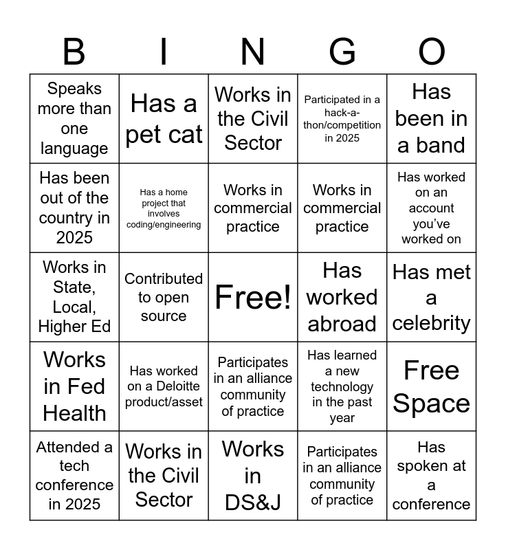 This bingo card has a free space and 40 words: Has worked on a Deloitte product/asset, Works in State, Local, Higher Ed, Speaks more than one language, Has a home project that involves coding/engineering, Works in the Civil Sector, Participates in an alliance community of practice, Works in commercial practice, Has been out of the country in 2025, Has been in a band, Works in Fed Health, Contributed to open source, Participated in a hack-a-thon/competition in 2025, Has spoken at a conference, Has met a celebrity, Has worked abroad, Has worked on a Deloitte product/asset, Works in State, Local, Higher Ed, Speaks more than one language, Has a home project that involves coding/engineering, Works in the Civil Sector, Free Space, Participates in an alliance community of practice, Works in commercial practice, Has been out of the country in 2025, Has been in a band, Works in Fed Health, Contributed to open source, Participated in a hack-a-thon/competition in 2025, Has spoken at a conference, Has met a celebrity, Has worked abroad, Attended a tech conference in 2025, Has a pet dog, Has learned a new technology in the past year, Has worked on an account you’ve worked on, Works in DS&J, Has been to a concert this year, Can spell Mark U’s last name on the first try, without looking it up, Has a pet cat and Has worked on the front-end/back-end of a publicly available website.