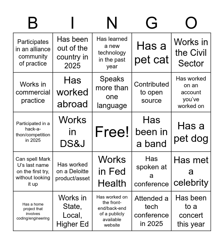 This bingo card has a free space and 24 words: Has worked on a Deloitte product/asset, Works in State, Local, Higher Ed, Speaks more than one language, Has a home project that involves coding/engineering, Works in the Civil Sector, Participates in an alliance community of practice, Works in commercial practice, Has been out of the country in 2025, Has been in a band, Works in Fed Health, Contributed to open source, Participated in a hack-a-thon/competition in 2025, Has spoken at a conference, Has met a celebrity, Has worked abroad, Attended a tech conference in 2025, Has a pet dog, Has learned a new technology in the past year, Has worked on an account you’ve worked on, Works in DS&J, Has been to a concert this year, Can spell Mark U’s last name on the first try, without looking it up, Has a pet cat and Has worked on the front-end/back-end of a publicly available website.
