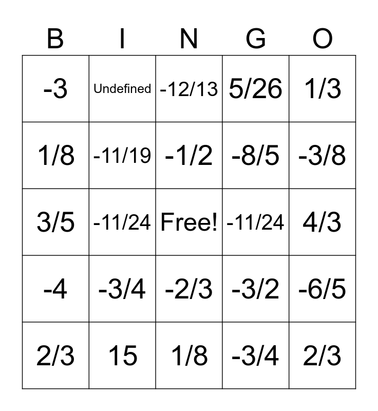 This bingo card has a free space and 174 words: -3, 7/3, 1/4, -4, 4/3, 0, 1/8, 1, 1/2, Undefined, 1, 1/2, 3/5, -5, 2/3, 1/4, -2/3, -1, 5/7, 5/2, 1/5, -5/8, -4, -2, -5/3, 3/4, -3/8, 4/7, -3/4, 1/3, -1/4, 5/2, -3/8, -3/2, -1/2, -8/3, -1/3, -1/5, -3/4, 5, -7/9, Undefined, -11/24, 7/8, 4, -6/5, -12/13, 5/26, 5/6, 15, Undefined, -15/17, -8/5, -11/19, 3/31, 35/34, -13/5, 36/7, -5, -4, -4, -3, -2, -1, 0, 1, 1, 4, 5, 15, 1/2, 1/2, 1/3, 1/4, 1/4, 1/5, 1/8, 2/3, 3/4, 3/5, 3/31, 4/3, 4/7, 5/2, 5/2, 5/6, 5/7, 5/26, 7/3, 7/8, -1/2, -1/3, -1/4, -1/5, -11/19, -11/24, -12/13, -13/5, -15/17, -2/3, -3/2, -3/4, -3/4, -3/8, -3/8, -5/3, -5/8, -6/5, -7/9, -8/3, -8/5, 35/34, 36/7, Undefined, Undefined, Undefined, Undefined, Undefined, Undefined, 36/7, 35/34, -8/5, -8/3, -7/9, -6/5, -5/8, -5/3, -3/8, -3/8, -3/4, -3/4, -3/2, -2/3, -15/17, -13/5, -12/13, -11/24, -11/19, -1/5, -1/4, -1/3, -1/2, 7/8, 7/3, 5/26, 5/7, 5/6, 5/2, 5/2, 4/7, 4/3, 3/31, 3/5, 3/4, 2/3, 1/8, 1/5, 1/4, 1/4, 1/3, 1/2, 1/2, 15, 5, 4, 1, 1, 0, -1, -2, -3, -4, -4 and -5.