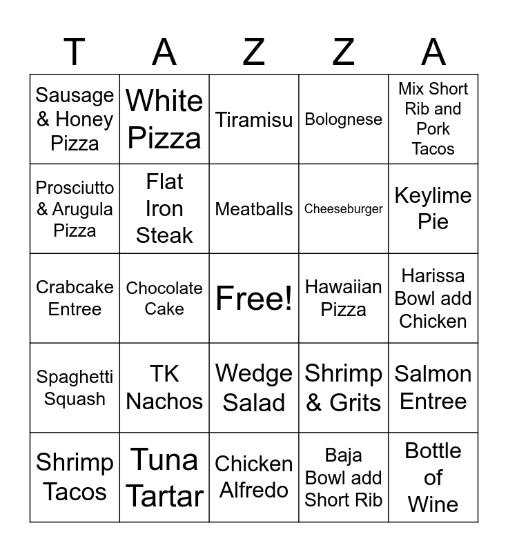 This bingo card has a free space and 24 words: TK Nachos, Tuna Tartar, Meatballs, Shrimp Tacos, Mix Short Rib and Pork Tacos, Sausage & Honey Pizza, Prosciutto & Arugula Pizza, White Pizza, Hawaiian Pizza, Wedge Salad, Cheeseburger, Crabcake Entree, Shrimp & Grits, Salmon Entree, Flat Iron Steak, Baja Bowl add Short Rib, Harissa Bowl add Chicken, Tiramisu, Keylime Pie, Chocolate Cake, Bottle of Wine, Spaghetti Squash, Bolognese and Chicken Alfredo.