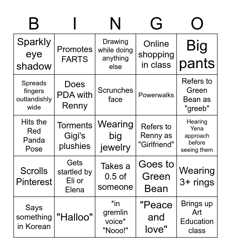 This bingo card has a free space and 24 words: Gets startled by Eli or Elena, "Halloo", Scrunches face, Says something in Korean, Big pants, Sparkly eye shadow, Spreads fingers outlandishly wide, Promotes FARTS, Refers to Renny as "Girlfriend", Takes a 0.5 of someone, Powerwalks, Hits the Red Panda Pose, Goes to Green Bean, Wearing 3+ rings, Does PDA with Renny, "Peace and love", Hearing Yena approach before seeing them, Drawing while doing anything else, Refers to Green Bean as "greeb", Torments Gigi's plushies, Brings up Art Education class, Scrolls Pinterest, Online shopping in class and *in gremlin voice* "Nooo!".