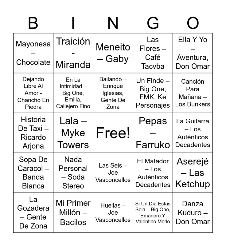 This bingo card has a free space and 60 words: Tabaco Y Chanel – Bacilos, Mi Primer Millón – Bacilos, Caraluna – Bacilos, Sopa De Caracol – Banda Blanca, Si Un Día Estas Sola – Big One, Emanero Y Valentino Merlo, Pa’ Que Te Acuerdes – Big One, Tiago PZK, La Joaqui, En La Intimidad – Big One, Emilia, Callejero Fino, Cuando Te Vi – Big One, Trueno, María Becerra, Un Finde – Big One, FMK, Ke Personajes, Eres – Café Tacvba, Las Flores – Café Tacvba, La Bicicleta – Shakira, Carlos Vives, Dejando Libre Al Amor - Chancho En Piedra, Lophophora - Chancho En Piedra, Historia De Amor Y Condón - Chancho En Piedra, Mayonesa – Chocolate, Danza Kuduro – Don Omar, Ella Y Yo – Aventura, Don Omar, Suavemente – Elvis Crespo, Bailando – Enrique Iglesias, Gente De Zona, Pepas – Farruko, Meneito – Gaby, La Gozadera – Gente De Zona, Aserejé – Las Ketchup, Provenza - Karol G, Gucci Los Paños - Karol G, TQG - Karol G, Miño – Los Bunkers, Canción Para Mañana – Los Bunkers, Ven Aquí – Los Bunkers, Llueve Sobre La Ciudad – Los Bunkers, No Me Hables De Sufrir – Los Bunkers, Ai Se Eu Te Pego – Michel Teló, Don – Miranda, Traición - Miranda, Perfecta – Miranda, Marisola – Cris MJ, Standly, Lala – Myke Towers, Desnuda – Ricardo Arjona, Historia De Taxi – Ricardo Arjona, Persiana Americana – Soda Stereo, Nada Personal – Soda Stereo, La Guitarra – Los Auténticos Decadentes, Los Piratas – Los Auténticos Decadentes, El Matador – Los Auténticos Decadentes, Un Amor Violento – Los Tres, He Barrido El Sol – Los Tres, La Torre De Babel – Los Tres, Mágico – Joe Vasconcellos, Las Seis – Joe Vasconcellos, Huellas – Joe Vasconcellos, Grado 3 – Glup, Enamorado De Ti – Glup, Ven Bailalo – Angel y Khriz, Me Matas – RKM, Una Vaina Loca – Fuego, Llamado De Emergencia – Daddy Yankee, Gasolina – Daddy Yankee, Lo Que Pasó, Pasó - Daddy Yankee and Rompe - Daddy Yankee.